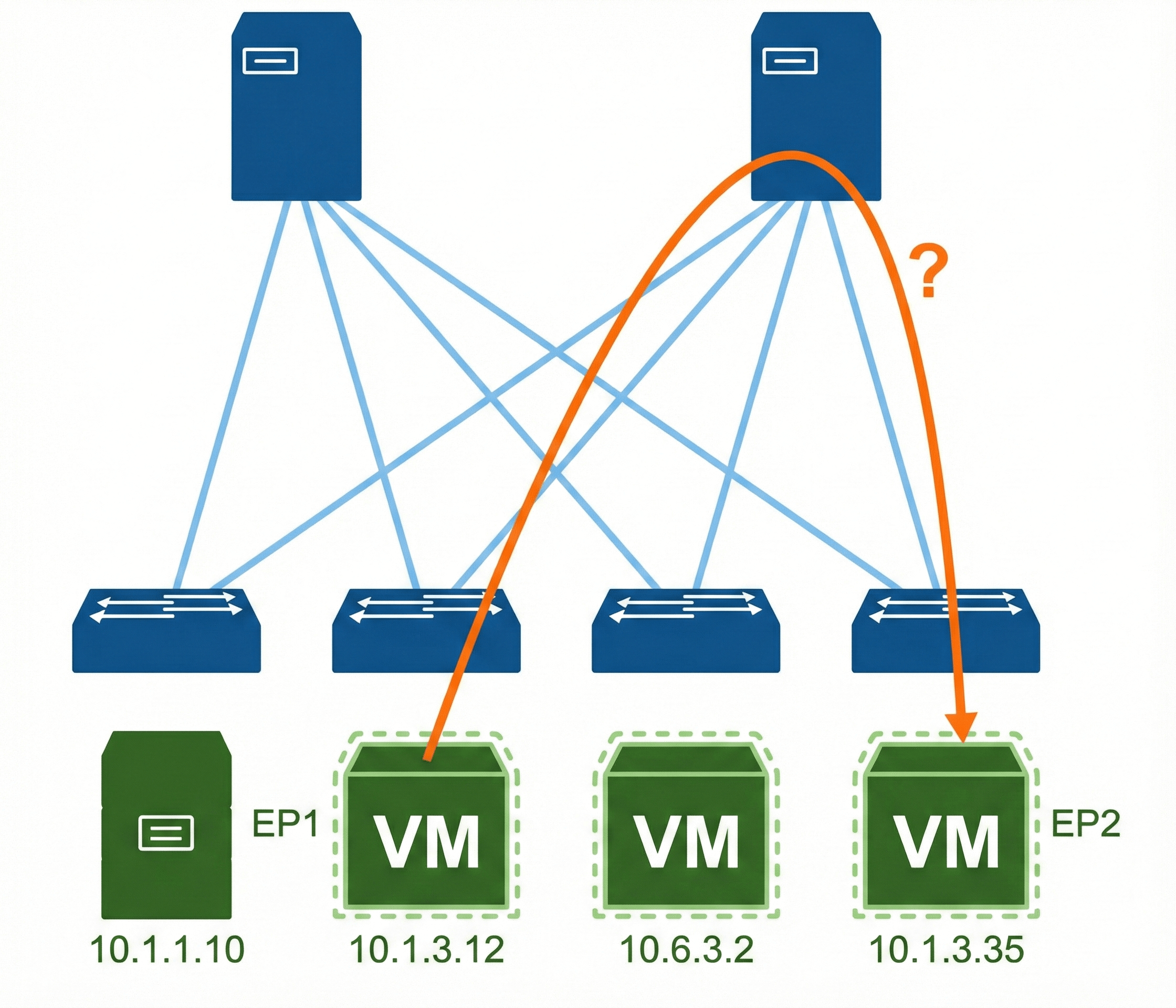The following figure depicts an endpoint connectivity issue between two VMs connected to the ACI fabric: