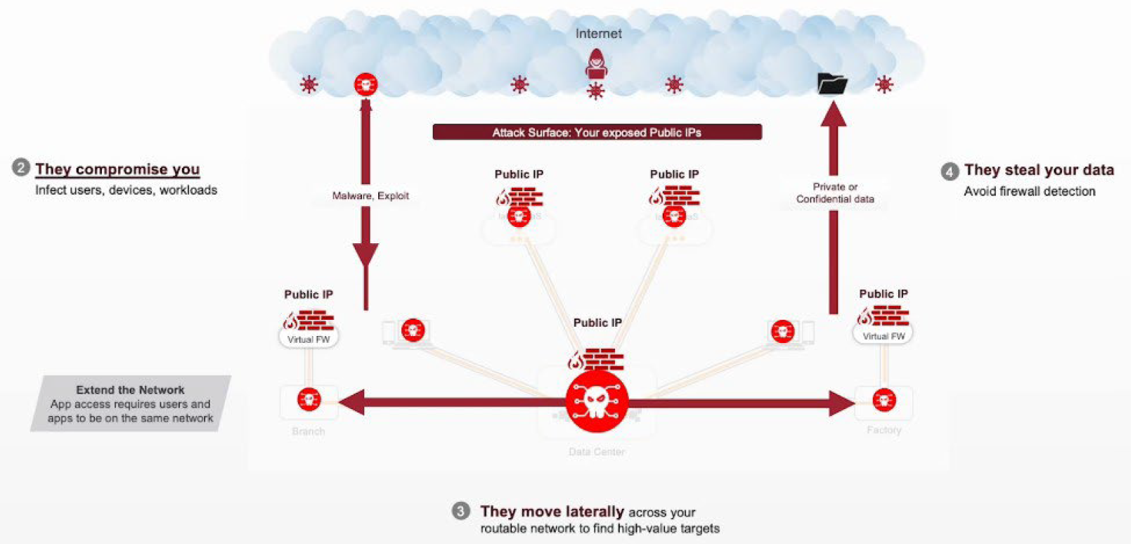 Traditional network architectures rely on extending a routable corporate network (“golden line”) from the data center to branches, remote users (via VPN), and now to public cloud workloads. This approach creates major security risks because: