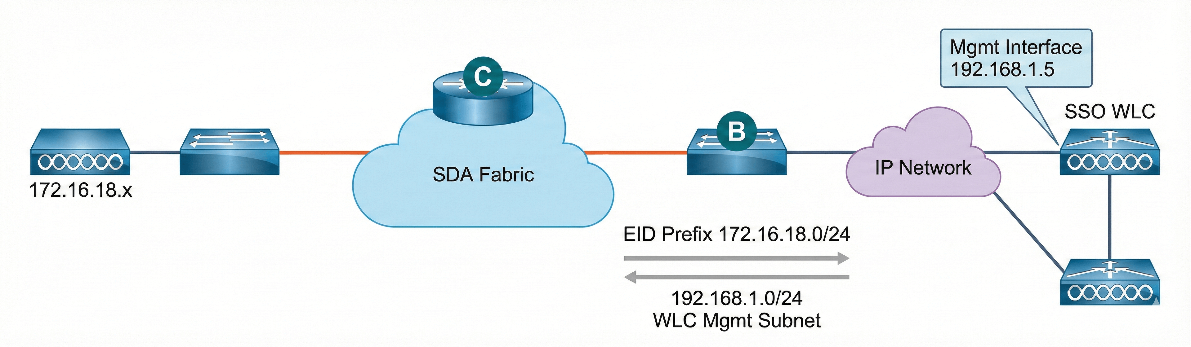 - The border advertises the WLC Management subnet into the fabric.