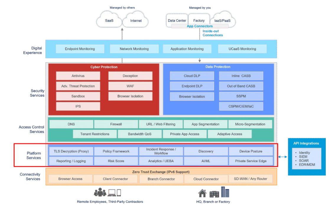 Throughout this chapter, we will dive deeper into the services outlined in the image above that work to enable other capabilities and the actions they take within the Zero Trust Exchange including:
