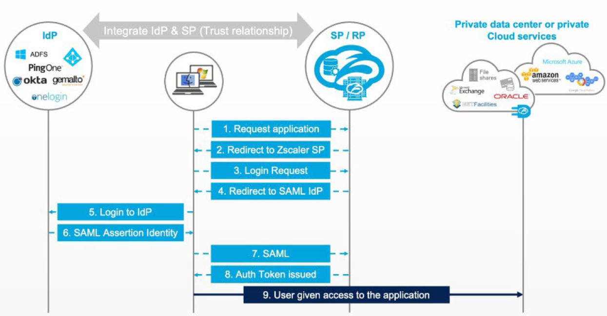 - Zscaler sends a SAML authentication request to the configured Identity Provider (IdP).