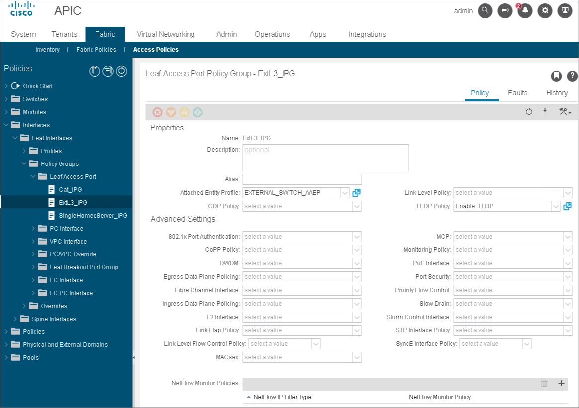 Go to Fabric > Access Policies > Interfaces > Leaf Interfaces > Policy Groups > Leaf Access Port. Examine the interface policy group ExtL3_IPG that you will use for the BGP_L3Out.