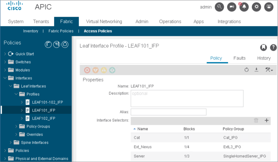 The interface profile LEAF101_IFP has been configured as a container for all access connections on leaf-a. You use it also for the L3Out connection to the external Cisco Nexus Switch Inter-Pod Network (IPN).
