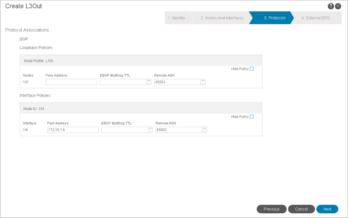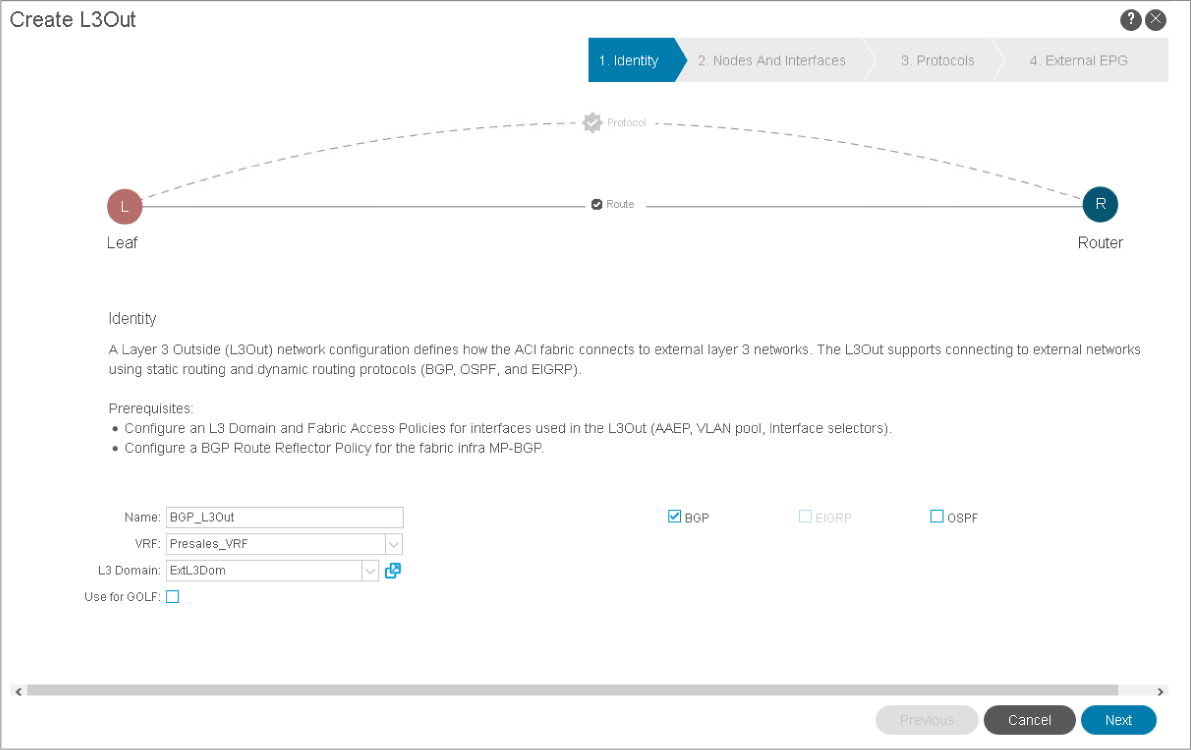 - The peering between the Cisco ACI and the external Cisco Nexus Switch will be established using Border Gateway Protocol (BGP).