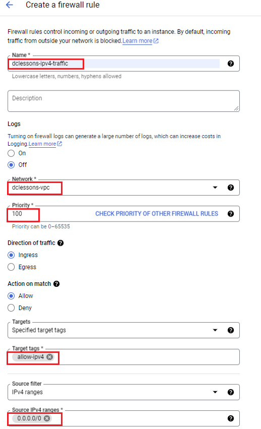 Provide Name: dclessons-ipv4-traffic | Logs: off| Network: dclessons-vpc, priority 100 | Direction of traffic: ingress| Action: Allow | targets: specified targets tags | target tags : allow-ipv4 |Source IPv4 ranges: 0.0.0.0/0