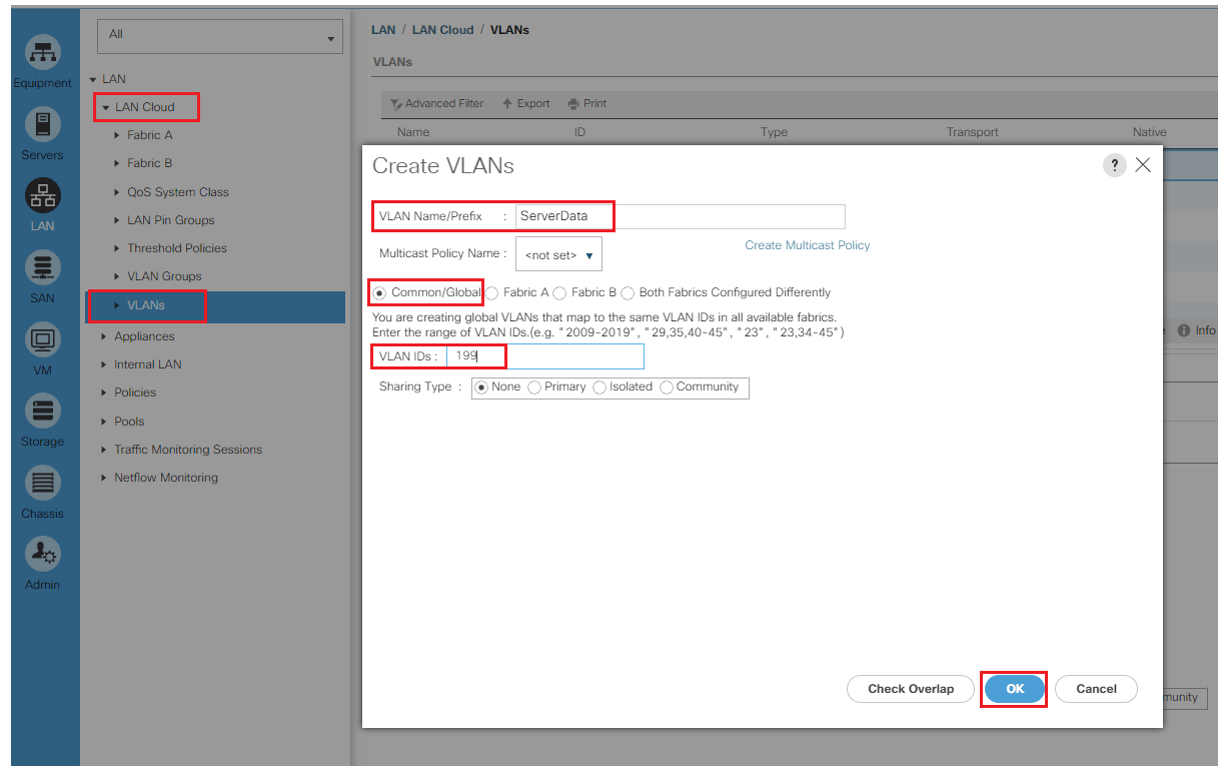 Go the the LAN tab | Highlight LAN CLOUD | Right-click and choose Create VLANs | Fill in the form like this: (make sure radio button set to Common/Global) | Click OK and confirm