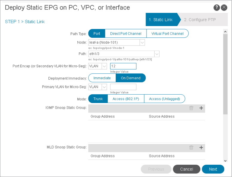 Within the Exchange_EPG, right-click on Static Ports and choose Deploy Static EPG on PC, vPC, or Interface. Configure a static path binding with the following parameters. Click Next and Finish.