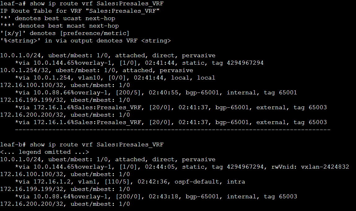 On leaf-a and leaf-b, verify external routes in the Presales_VRF. Look for the external network 172.16.100.100/32, received from the 3560 SW.