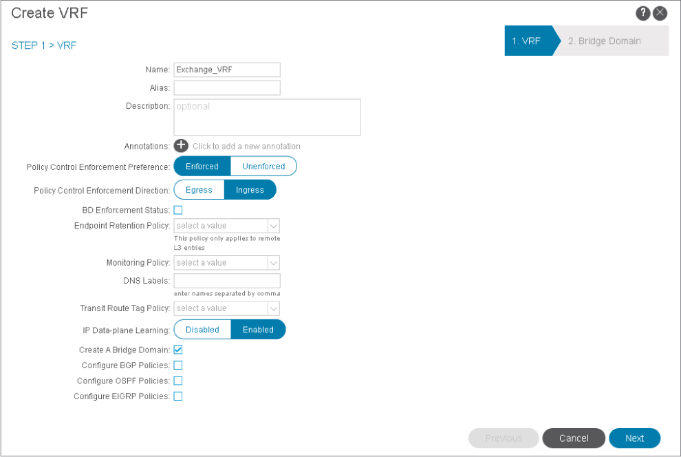 Go to Tenants > Sales > Networking, right-click VRFs, and choose Create VRF. Create Exchange_VRF and click Next to proceed with bridge domain configuration.