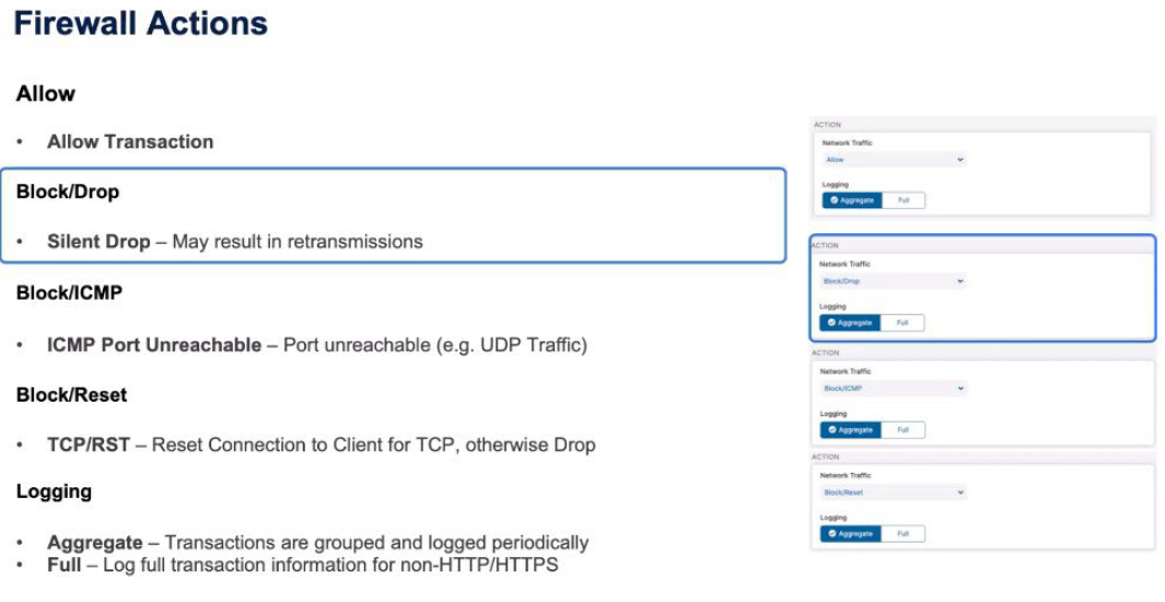 The actions when those rules trigger might be; ALLOW obviously to allow the transaction. BLOCK/Drop, which is a silent drop of that traffic that may result in retransmissions from the client. A BLOCK ICMP means that the client receives an ICMP port unreachable, which might be equal to a Drop for, say, UDP traffic. A BLOCK/RESET is when the client gets a TCP reset, which forcibly closes the connection, but obviously means that the client knows there’s a firewall in play. If it’s not TCP they just get a straight Drop so UDP retransmissions may occur.