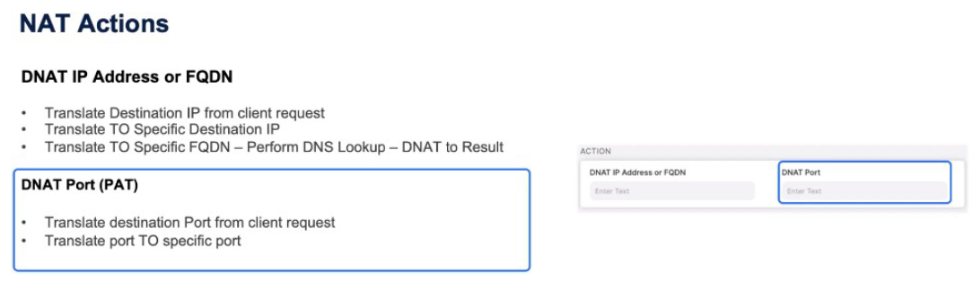 The NAT actions are, do I perform a destination address translation? So you are going to either destination NAT it to a specific IP or to an FQDN, which triggers the Zscaler Service Edge to perform a DNS Lookup and DNAT (Destination NAT) to the result of that DNS Lookup. Then you can do a DNAT on the port, which is a port address translation, which means you might say port 80 from the client changes to port 8080 when it egresses the Zscaler Service Edge.