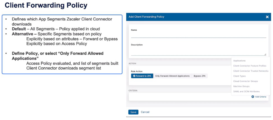 Zscaler Cloud Connector and machine tunnels do not support reauthentication timers so they're excluded as criteria from this rule type. In the Client Forwarding policy, which makes the decisions, should the Zscaler Client Connector download these segments? And then you can make a policy decision based on specific criteria; the applications, the Zscaler Client Connector profiles, the trusted networks, the client types, those machine groups, Zscaler Cloud Connector groups, or the SAML and SCIM attributes, and make explicit rules for either forwarding or bypassing ZPA. Or, you can make the decision simple and say “only forward allowed applications” so the access policy is evaluated and only applications which are allowed access are then downloaded as part of the Client Forwarding policy.