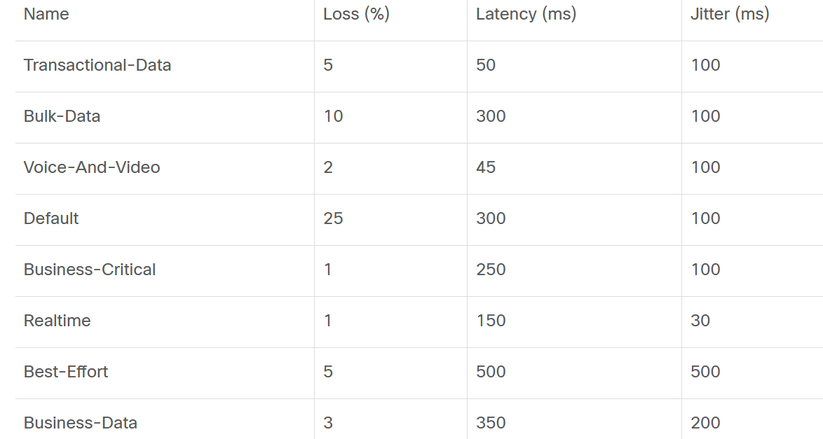 The predefined SLA values (loss, latency, and jitter) are round-trip measurements and are specific to the WAN transport characteristics. The predefined SLA class values, shown in the table, might or might not fit all deployment needs. The Cisco vManage GUI provides the flexibility to define the custom SLA class instead of using the predefined SLA class.