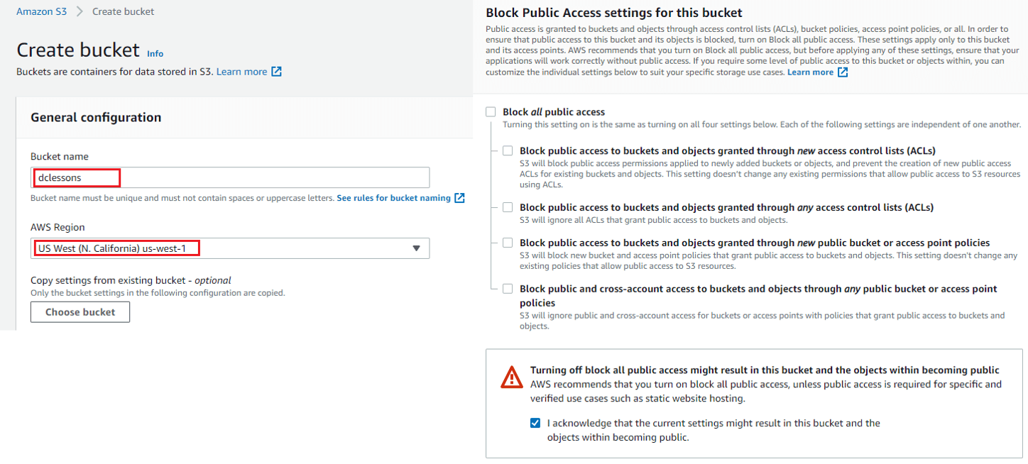 Choose the name of Bucket as dclessons and region US West (N. California) | keep the config as shown in below figure | Select Create Bucket.