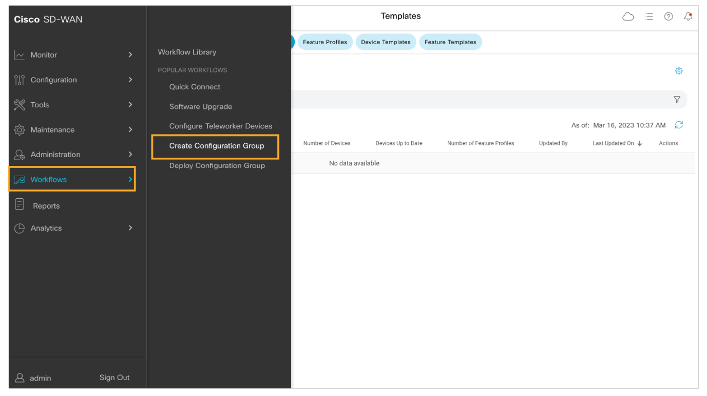 Step1: From the main menu, navigate to Workflows and choose the Create Configuration Group workflow.