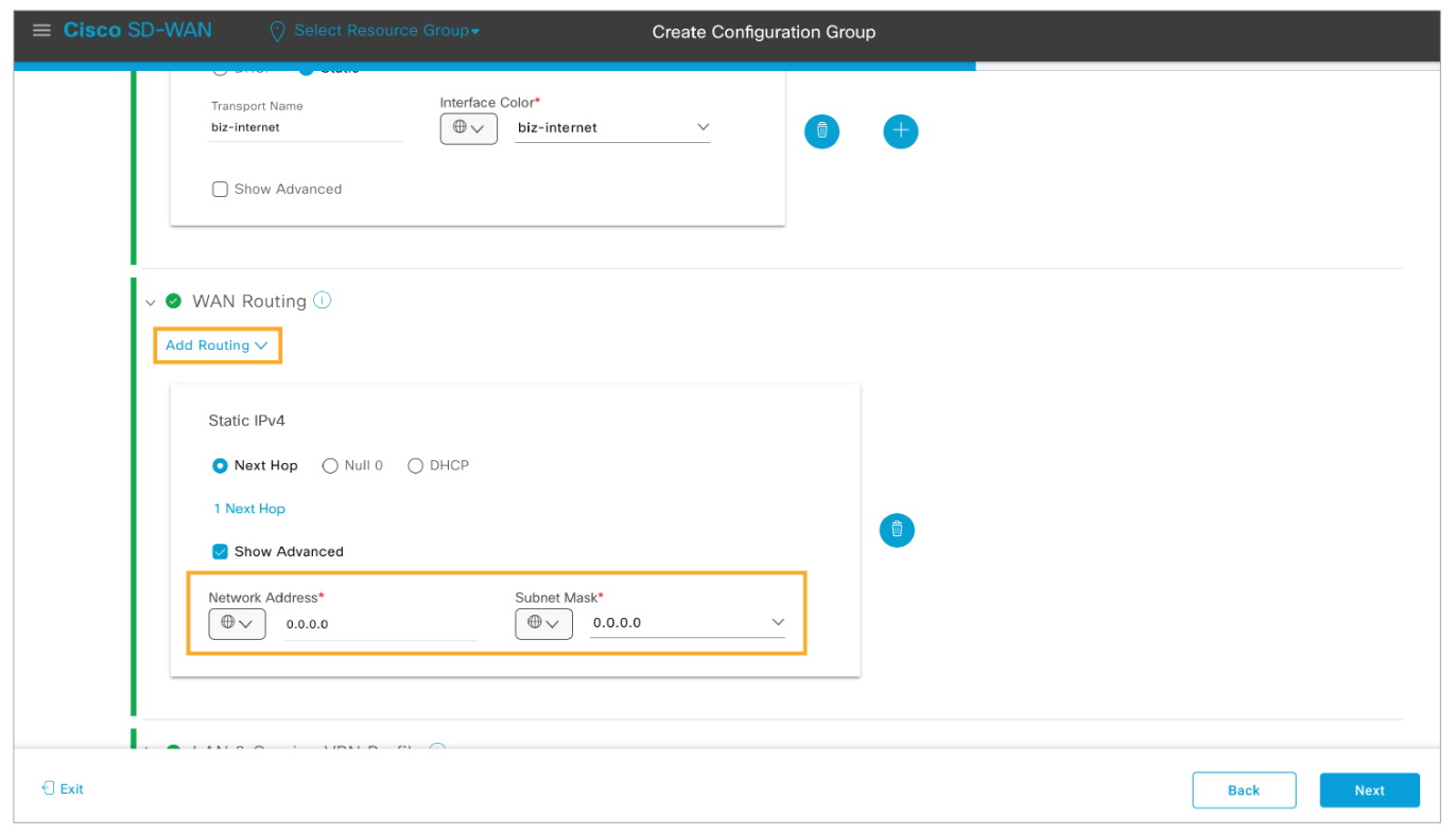Step 7: Scroll down and expand the WAN Routing section. Click Add Routing and choose Static IPv4. Configure a default route with 0.0.0.0 as the Network Address and Subnet Mask.