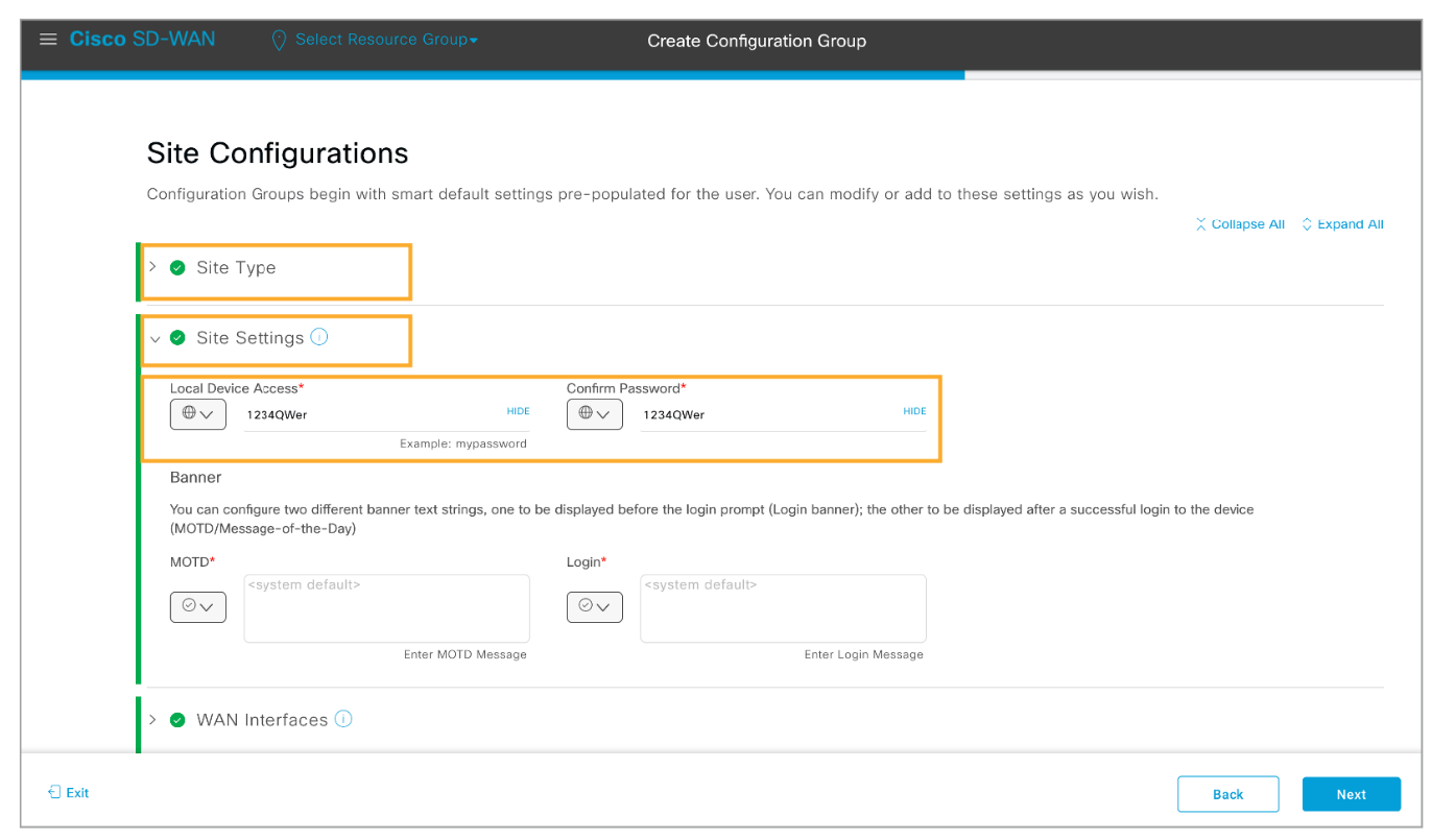 Step 3: Collapse the Site Type and expand the Site Settings section. Set the Local Device Access parameter as a Global value and enter the XXXXX password and confirm it.