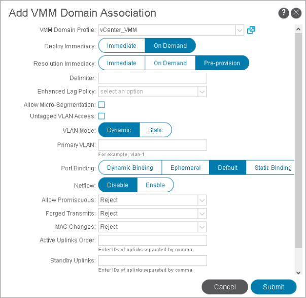 Right-click Backup_EPG, choose Add VMM Domain Association, and associate it with the VMM domain vCenter_VMM. Click Submit.