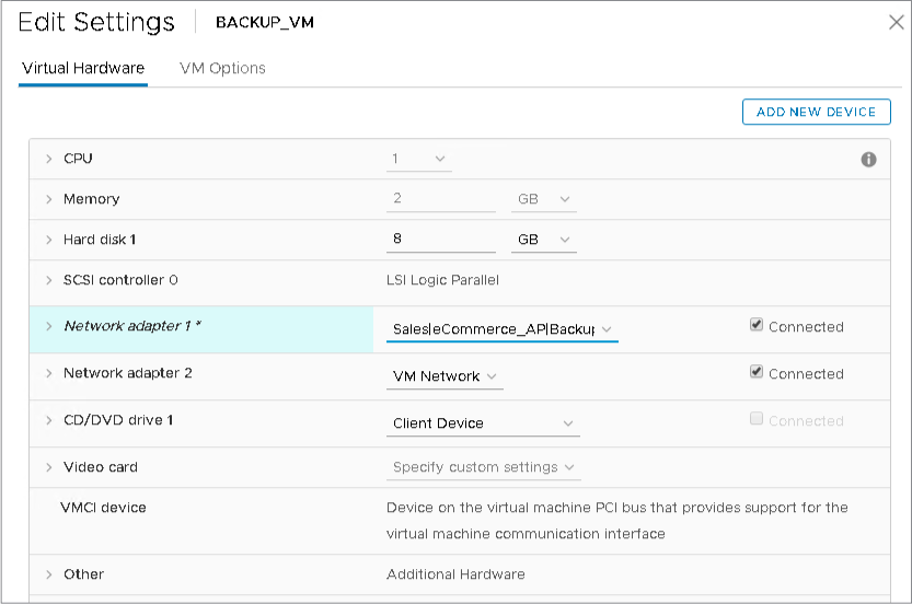 In the vSphere Client, choose the BACKUP_VM, choose and click the Edit Settings button in the top taskbar. Assign the first network adapter to the port group created for the BACKUP_EPG.