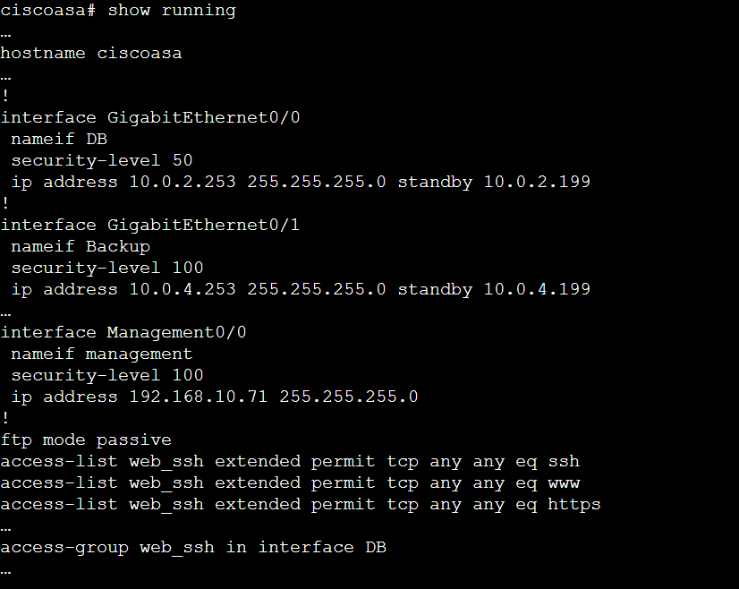 Use PuTTY to connect to ASAv by name asav. Log in as admin with password XXXX and briefly examine the configuration.