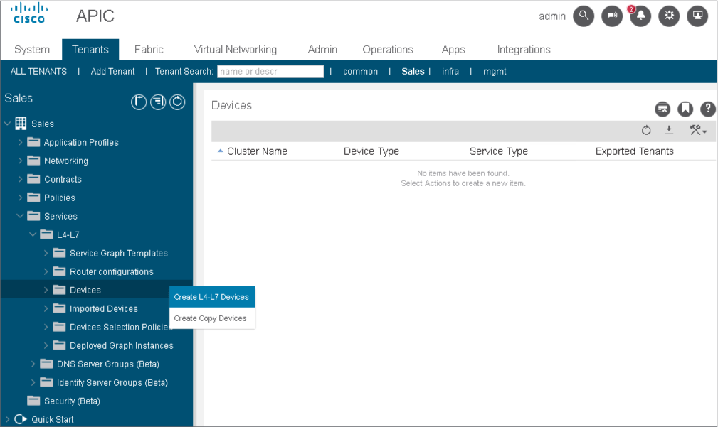 In the Cisco APIC user interface, within tenant Sales, go to Services > L4–L7 > Devices, right-click the menu, and choose Create L4–L7 Devices.