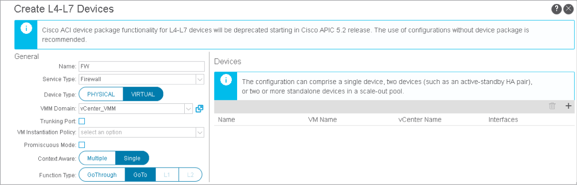 A device cluster (also known as a logical device) is one or more concrete devices that act as a single device. A device cluster has cluster (logical) interfaces. In this example, you have ASAv without any clustering. You will create a device cluster that includes only one concrete device (ASAv VM). The interfaces of the device cluster (cluster interfaces) are the interfaces of the ASAv VM adapters. These interfaces specify how the ASAv VM connects to the ACI.
