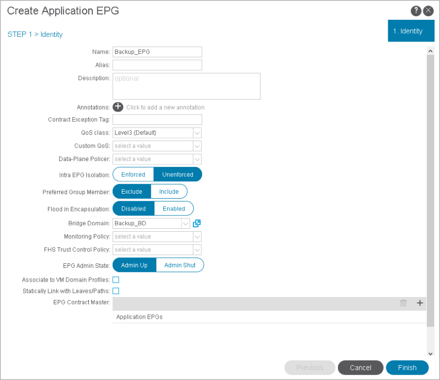 Go to Application Profiles > eCommerce_AP > Application EPGs. Create a new EPG Backup_EPG, associate it with the bridge domain Backup_BD and click Finish.