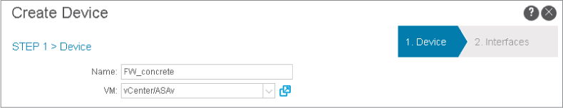 In the Devices area, click the plus sign (+), enter the name of the concrete device FW_concrete, choose the ASAv VM, and click Next.