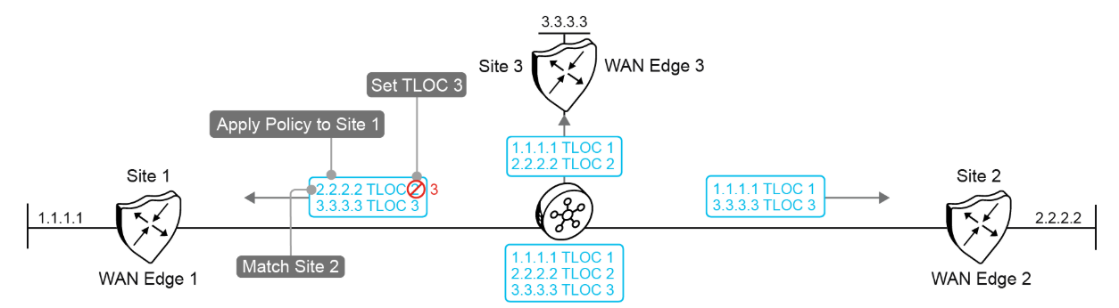 The policy statement matches all announcements of Site 2 networks and changes the TLOC to 3.