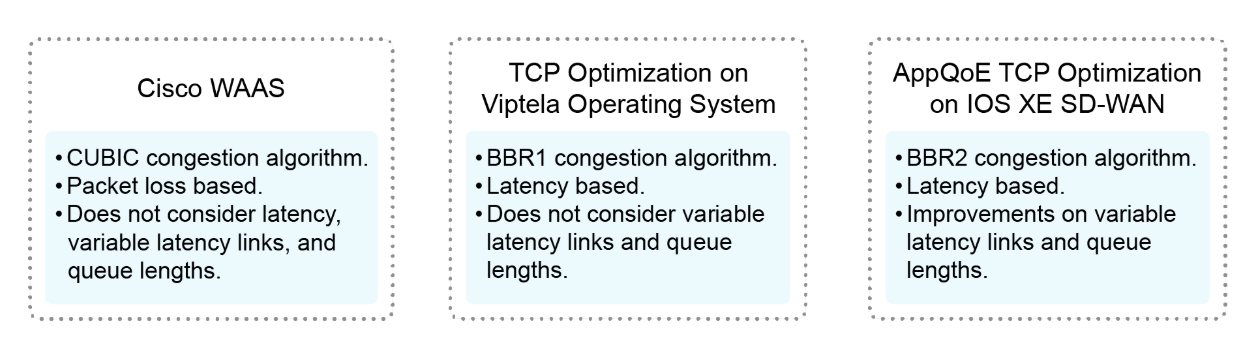 AppQoE adopts BBR2, an enhanced version of BBR1, which considers variable latency links and queue lengths while reducing retransmissions. Recall that AppQoE also incorporates features such as FEC, packet duplication, and DRE or LZ, further enhancing the overall application experience for on-premises or cloud-based deployments.
