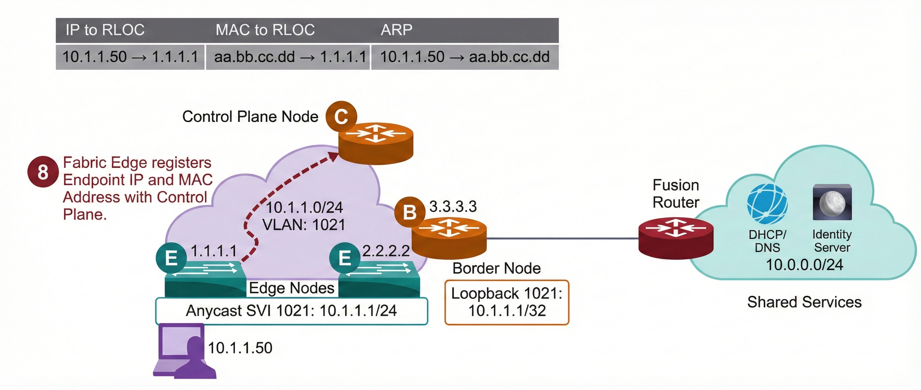 8. Once the endpoint is assigned the address, the fabric edge registers Layer 2 and Layer 3 endpoint information with the Fabric Control Plane.