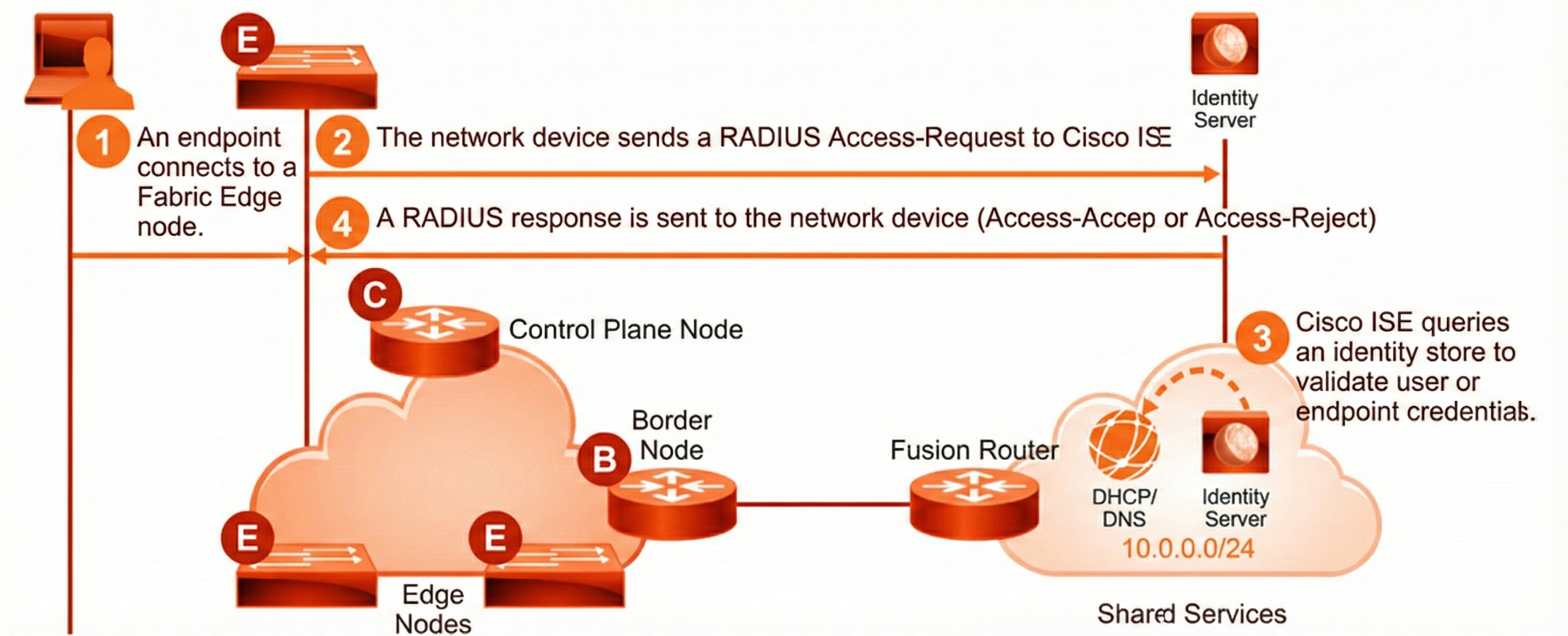 - The fabric edge node sends a RADIUS Access request to Cisco ISE. The request contains the appropriate RADIUS attributes for the protocol used (PAP, CHAP, MS-CHAPv1, or MS-CHAPv2).