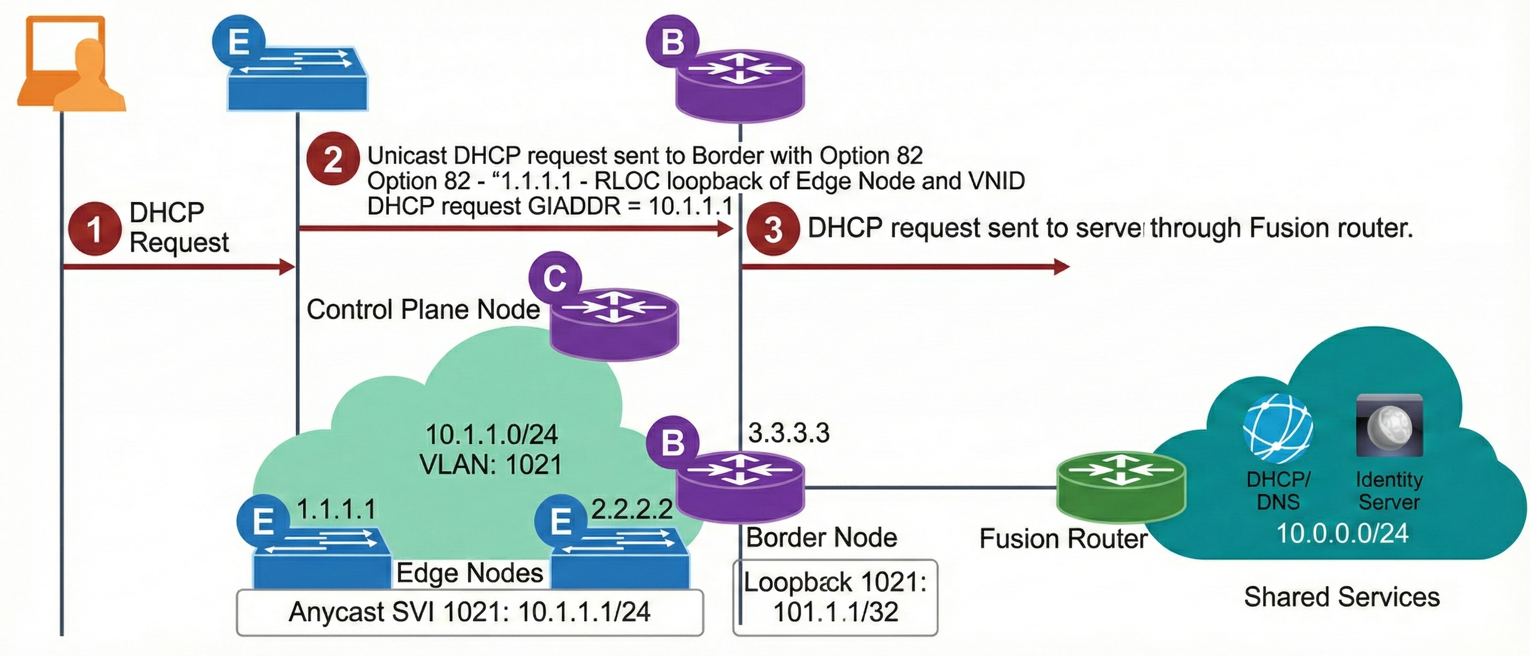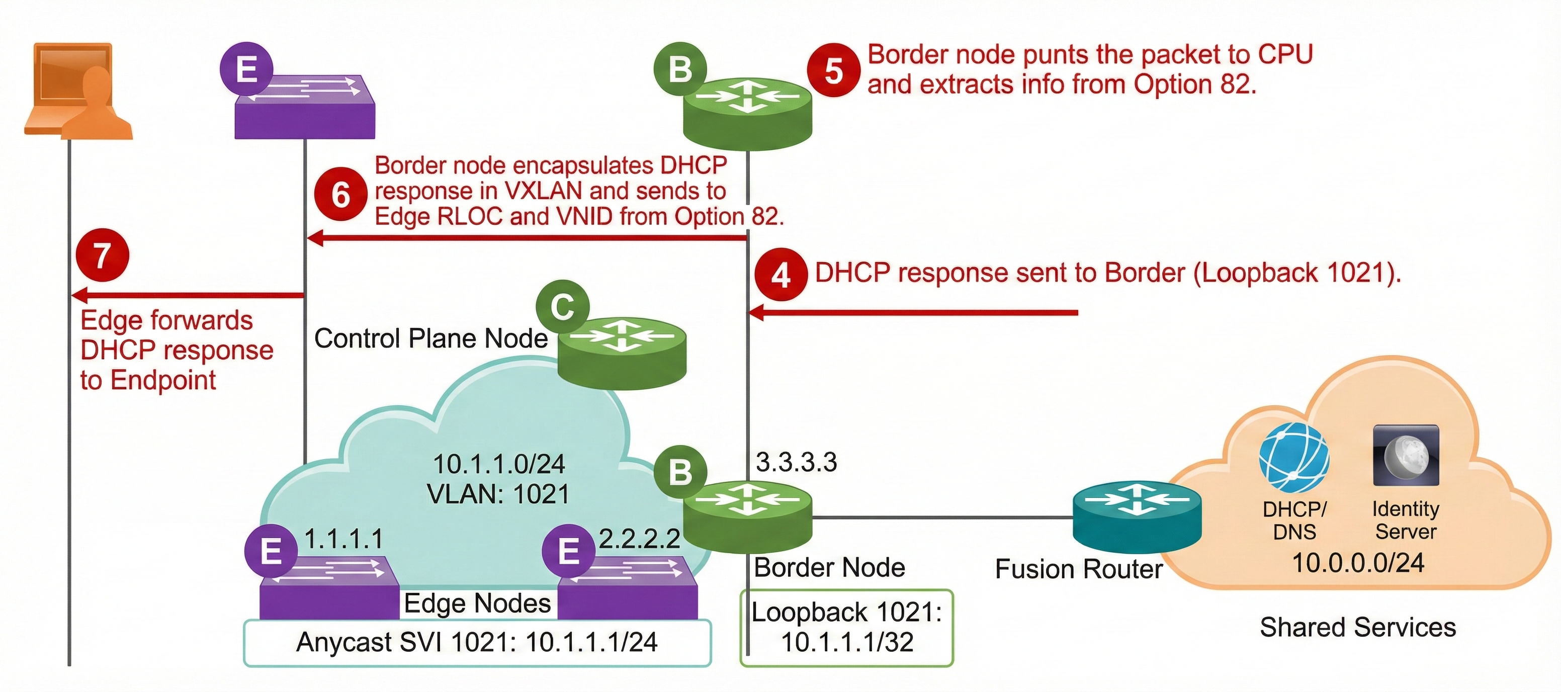 - The request is then sent to the fabric border for delivery to the DHCP server.