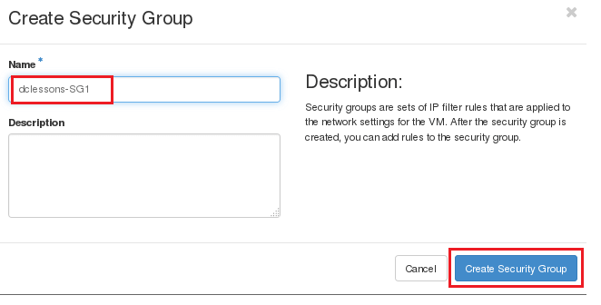 Now to configure the Security group go to Project | Compute | Access & Security and In the Security Groups tab, click on + Create Security Group.