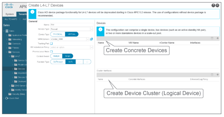Cisco ACI defines a L4-L7 device as an object to represent the service devices such as firewall or load balancer. These service devices typically form a cluster and Cisco ACI treats them as one single logical entity and call it a device cluster or a logical device. A device cluster has cluster (logical) interfaces.