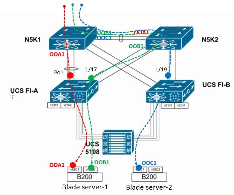 - From Blade server-1: vNIC1 (having mac 00A1) is pinned to UCS FI-A uplink port channel Po1. vNIC2 (having mac 00B1) is pinned to UCS F1-A uplink 1/17.