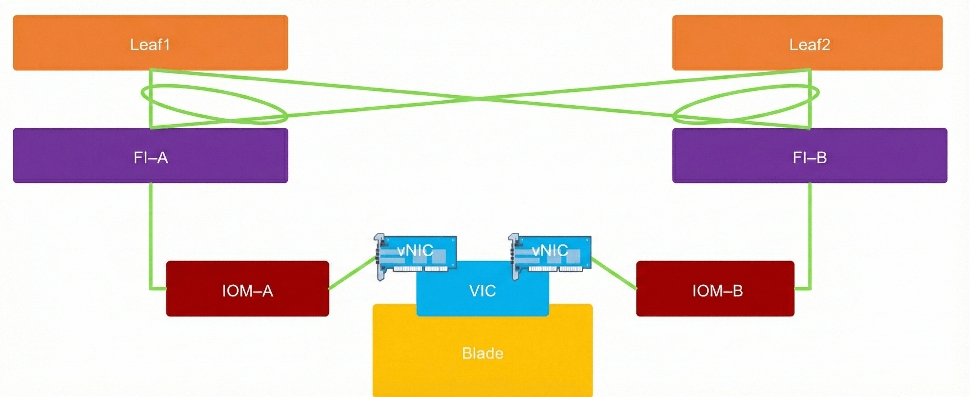 The example above utilizes a redundant pair of fabric interconnects in a cluster configuration, FI-A and FI-B, for high availability, connected to the chassis I/O modules (IOMs). If one fabric interconnect becomes unavailable, the other takes over, since the cluster configuration actively enhances failover recovery time for redundant virtual interface connections.